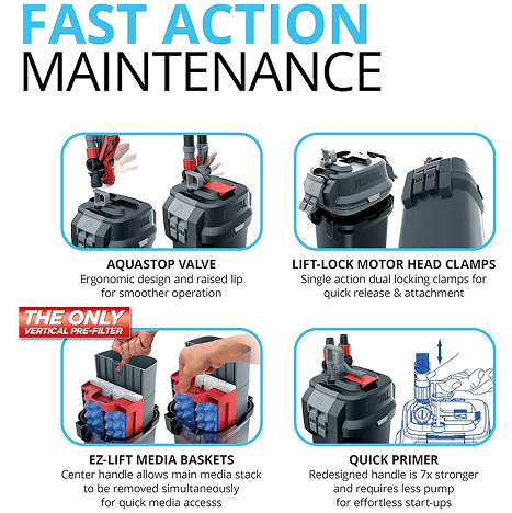 Inside, the filter uses EZ-Lift media baskets with a central handle, allowing all media trays to be removed at once with just one finger. This makes maintenance much simpler compared to traditional canisters. The large capacity also gives aquarists flexibility to use mechanical sponges, activated carbon, and biological media (like ceramic rings) in the same filter.