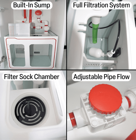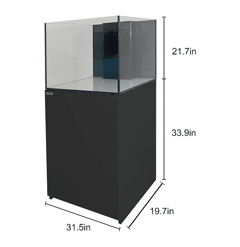 🔹 Complete Package: This setup includes a 58-gallon display tank, a prebuilt matte-finish cabinet, and a 32-gallon sump filtration system—already assembled and ready to use. The sump design offers multiple chambers, including a filter sock unit, protein skimmer/general section, top-off reservoir, customizable chamber, and return pump section, giving advanced water management right from day one.