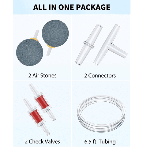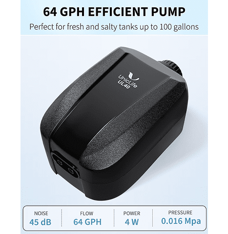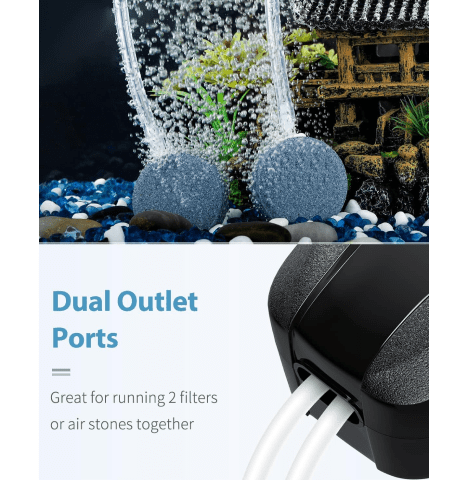 Keep your aquarium fully oxygenated with the Uniclife Air Pump, a reliable aerator suitable for tanks from 5 to 200 gallons. It features dual outlets with an adjustable rotary knob, letting you control airflow for perfect oxygen levels. Despite its power, it runs quietly (as low as 25 dB) and includes everything you need: 2 air stones, airline tubing, check valves, and connectors for a complete setup. Available in multiple sizes (5–30 gal, 10–100 gal, and 100–200 gal), it’s adaptable to tanks of all capacities.